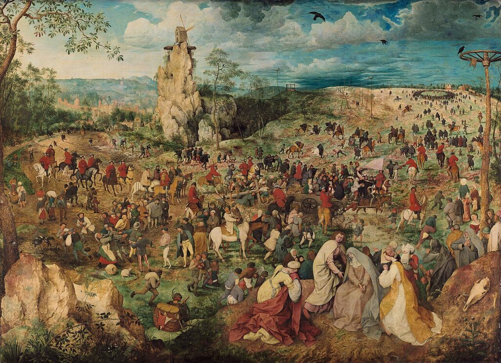 Bruegel affronta la Passione in modo sorprendente. Nella sua Salita al Calvario, Cristo quasi scompare nella vastità del paesaggio e nella molteplicità della folla. Per trovarlo bisogna cercarlo.