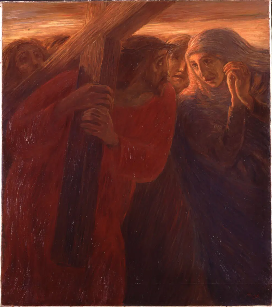 L’inserimento di Previati introduce nell’articolo un’altra epoca e un altro modo di sentire l’arte sacra. Qui non siamo più nella solidità plastica del Rinascimento né nel naturalismo drammatico del Barocco. Siamo in un clima simbolista, tardo ottocentesco, in cui la pittura tende a farsi vibrazione, luce, atmosfera interiore. Nella IV stazione della sua Via Crucis, Previati non costruisce una scena in senso teatrale o narrativo tradizionale. La sua attenzione si concentra piuttosto sul moto spirituale dei personaggi.