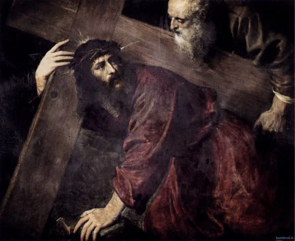Con Tiziano torniamo a una pittura piena, ricca, animata da una straordinaria energia cromatica e narrativa. Nelle sue scene della Passione, il colore non serve soltanto a descrivere: costruisce la tensione emotiva, modella i volumi, trascina l’occhio dello spettatore dentro l’azione. Il rapporto tra Cristo e il Cireneo è reso con forza fisica, quasi tattile. I corpi si accostano, si sostengono, si contrastano nello spazio del dipinto.